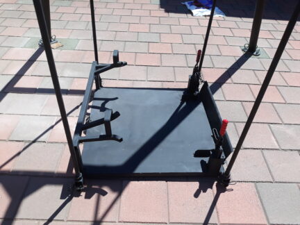 The wheelchair is secured with frames for rear wheels & locking clamps for front.