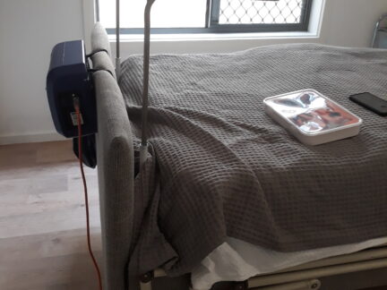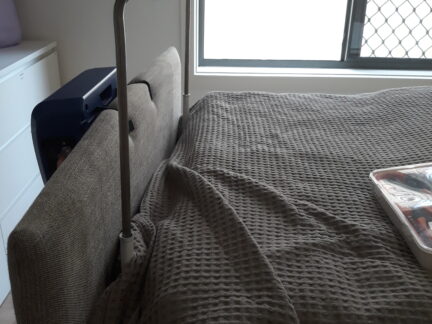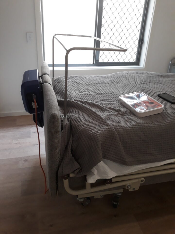 Since he is also very tall, John made sure that this modification did not add more pressure to the soles of his feet. The main hoop part of the cradle (which comes in contact with the bed linen) was made with stainless steel while the brackets attaching the cradle to the bed are painted mild steel. The lower frame slides underneath the mattress, securing the cradle to the bed, while the upper frame is positioned horizontally over the lower limbs. The bed cradle is easily removable and can be adjusted to height requirements when the client’s care team is in action.