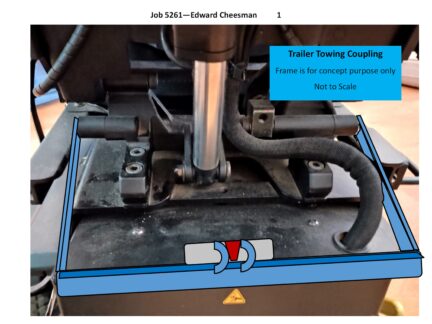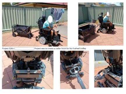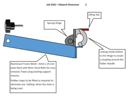 In response to the client’s requirement for a coupling or hitch to attach a four-wheeled trolley or trailer to his wheelchair, technical member, Glen, proposed an innovative solution that prioritizes both functionality and ease of use. The design involves creating a frame that is securely attached to the existing mounting points on the wheelchair.