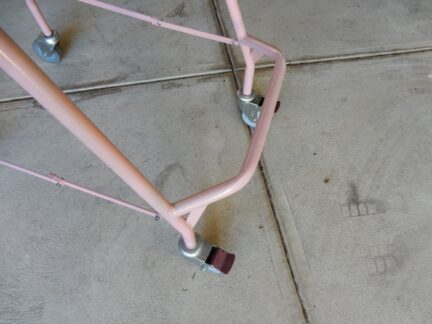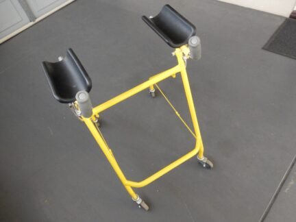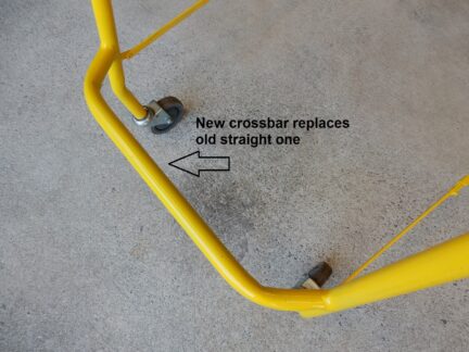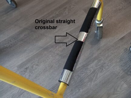 The situation involves two different walkers, each requiring unique modifications to improve usability. The first walker, an older yellow model, has become problematic in that her lower leg frequently strikes the lower cross arm with each step. To address this issue, we proposed replacing the existing front horizontal bar with a new one that is 50mm higher and 100mm further forward. This modification involved fabricating a new curved tube from 25mm material and welding it into place before cleaning up and repainting the frame.