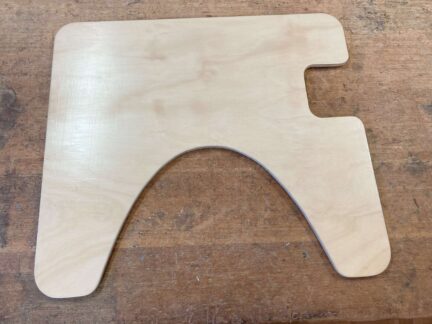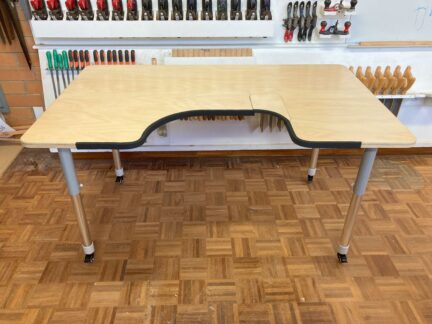 Our client, Anna, requested a C-shaped table to improve her access during online work and writing. Stuart from TADSA made this brilliant piece of furniture. This custom-made table accommodates Anna's electric wheelchair and includes a designated space for the armrest. A joystick was added allowing Anna to easily open and close the armrest portion.