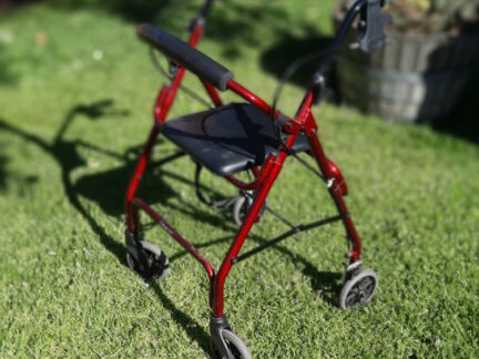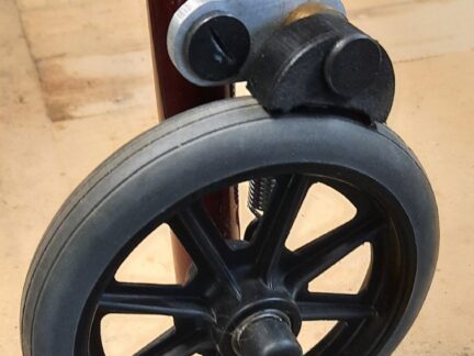 Jamie had difficulty using the brakes on his walker due to brain injury. His OT suggested reverse braking action so Jamie has to apply the brakes to move forward and release when stopping. TADSA attached a lever with a pivoting brake pad to suit the flat profile of the tyres.